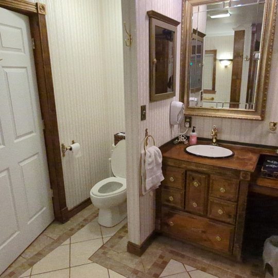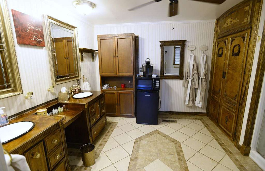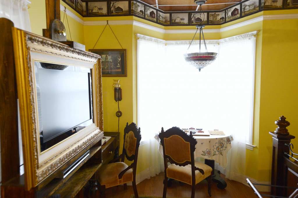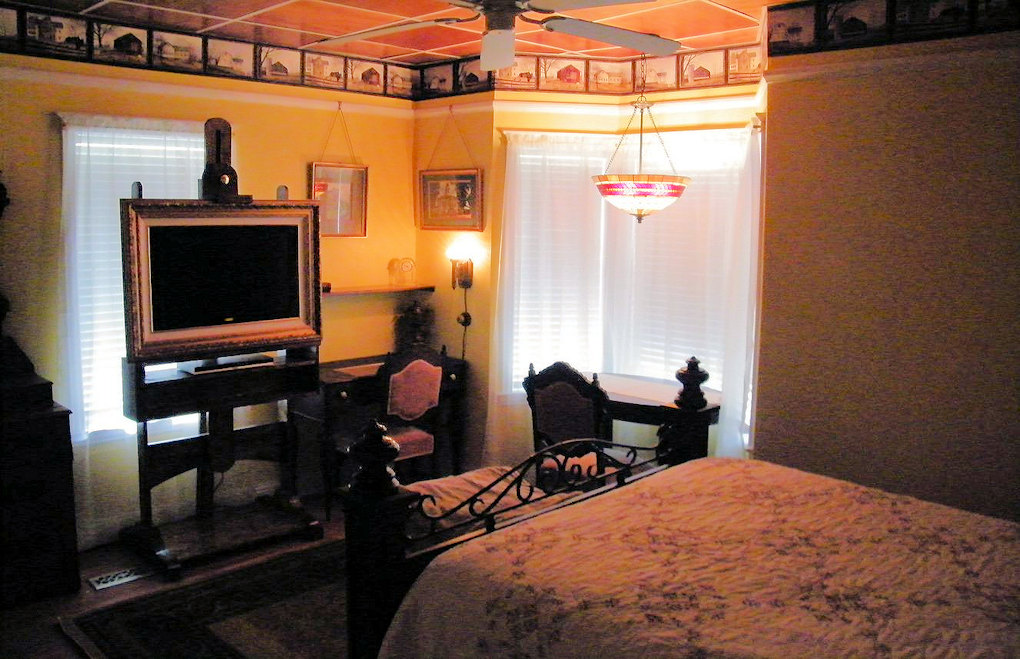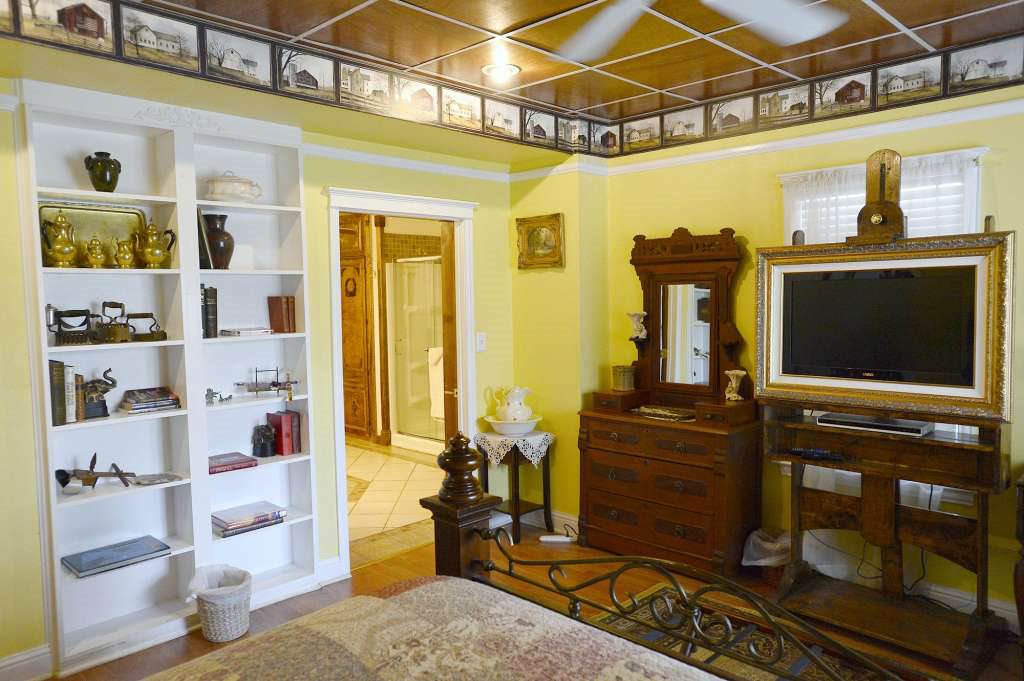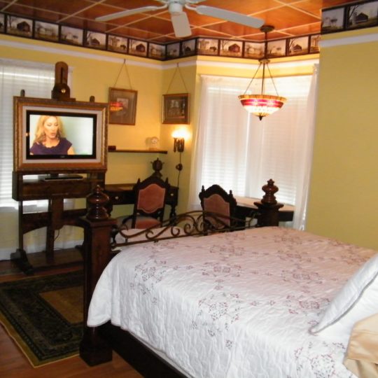 The yellow room has a queen size bed accompanied by a bureau and an antique work desk. The room also has its own mini refrigerator with complimentary bottled water, and sodas, a microwave, and a coffee maker with an assortment of various coffee flavors. The bathroom comes complete with a hair dryer, iron, and ironing board. The bedroom has a beautifully framed flat-screen Smart TV with a DVD player for your enjoyment. A large collection of DVDs is also available from our movie library. And don’t forget free WiFi. Guests in this room are the first to smell the breakfast cooking each morning.