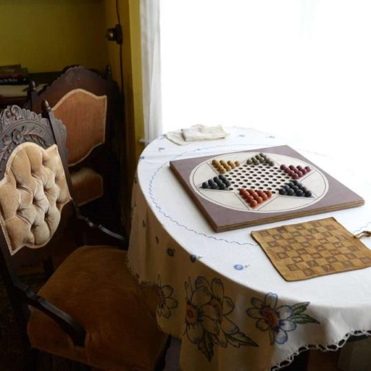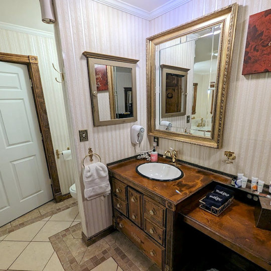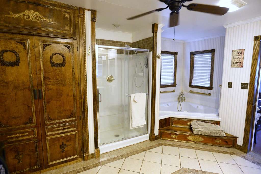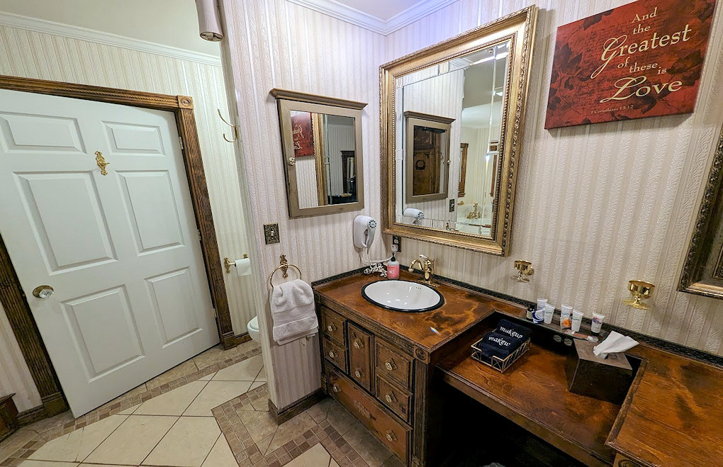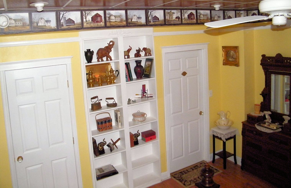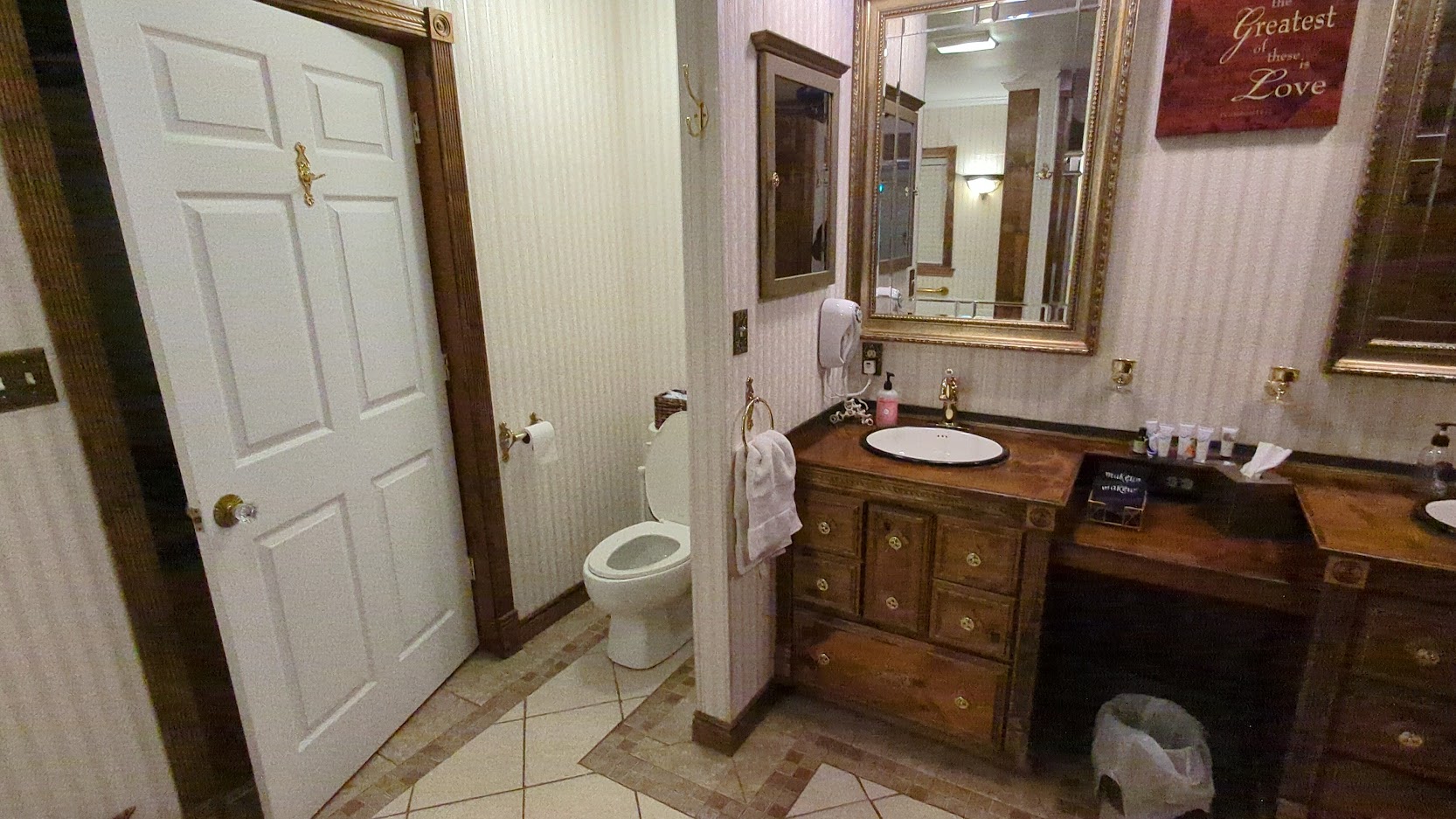 The yellow room has a queen size bed accompanied by a bureau and an antique work desk. The room also has its own mini refrigerator with complimentary bottled water, and sodas, a microwave, and a coffee maker with an assortment of various coffee flavors. The bathroom comes complete with a hair dryer, iron, and ironing board. The bedroom has a beautifully framed flat-screen Smart TV with a DVD player for your enjoyment. A large collection of DVDs is also available from our movie library. And don’t forget free WiFi. Guests in this room are the first to smell the breakfast cooking each morning.